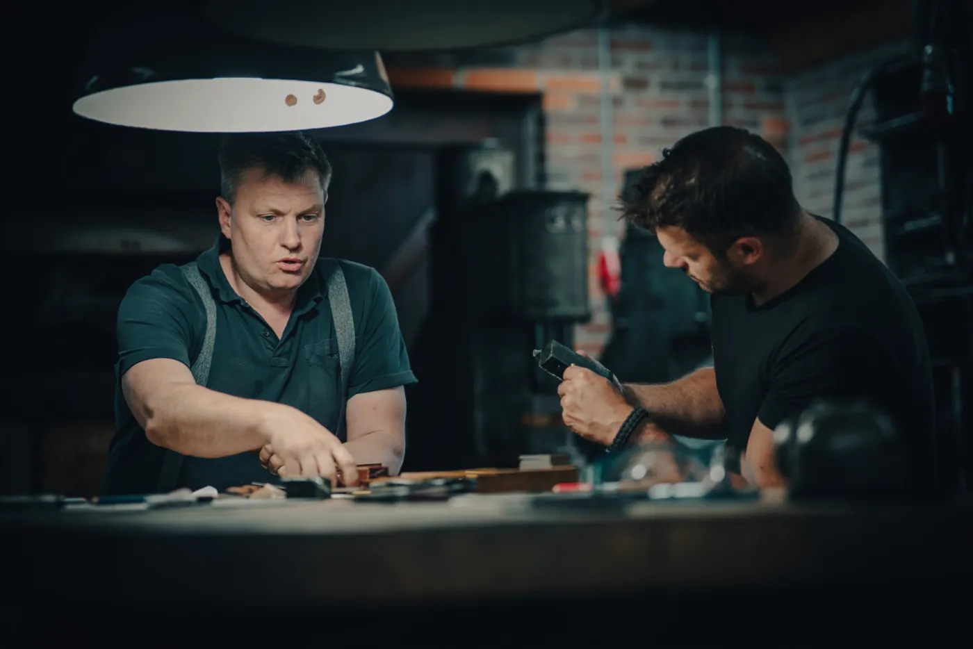 Dann beginnt die eigentliche Arbeit und Du stellst Dein eigenes Damastpaket zusammen und verschweißt es anschließend mit Hammer, Amboss und Lufthammer. Wir falten dieses Paket mehrmals, um die gewünschte Anzahl an Lagen zu erhalten. An diesem Tag wirst Du das alte Handwerk und die Hitze, die zum Schmieden des Stahls benötigt wird, wirklich erleben. Das Endergebnis wird erneut in einem Ofen auf 730°C erhitzt, danach wird es während der Nacht langsam wieder abgekühlt und wir können es am nächsten Tag weiter bearbeiten.
