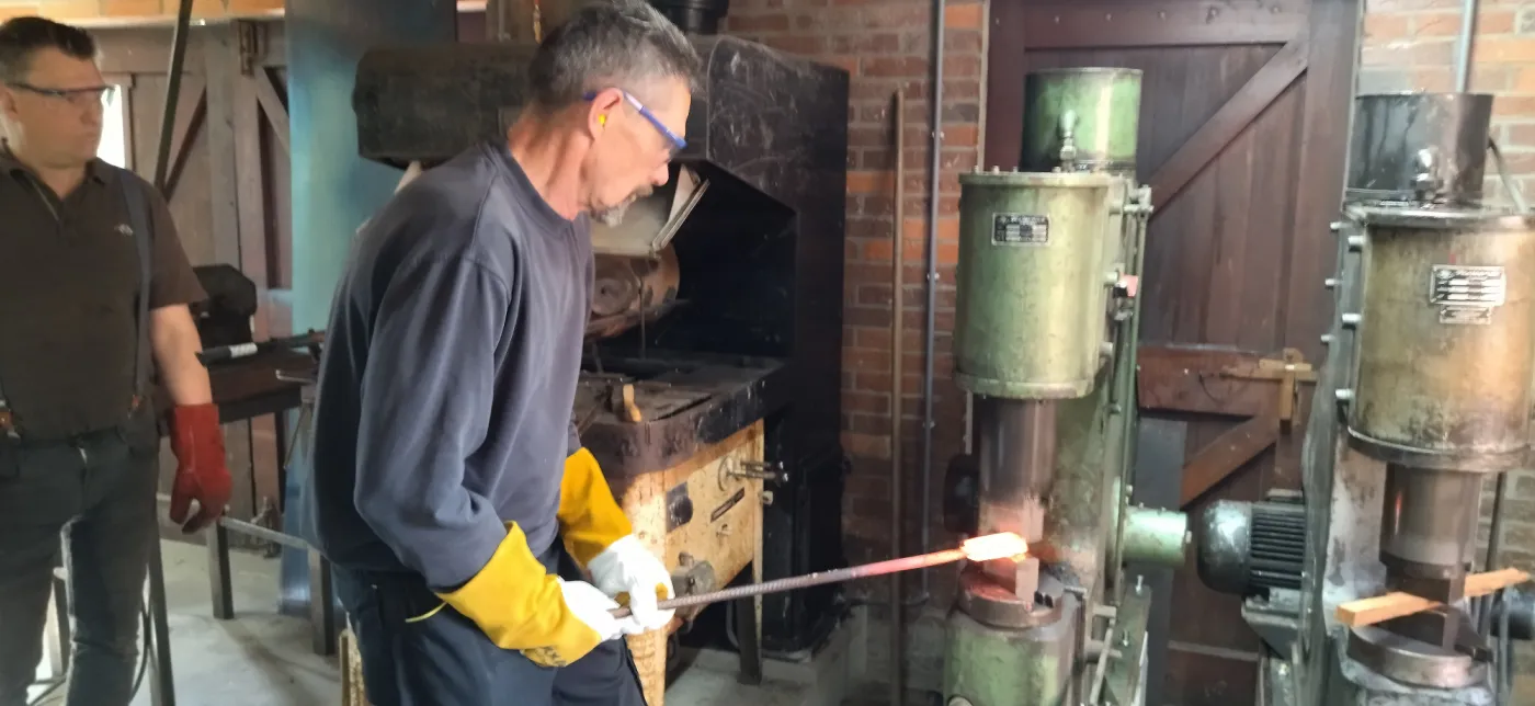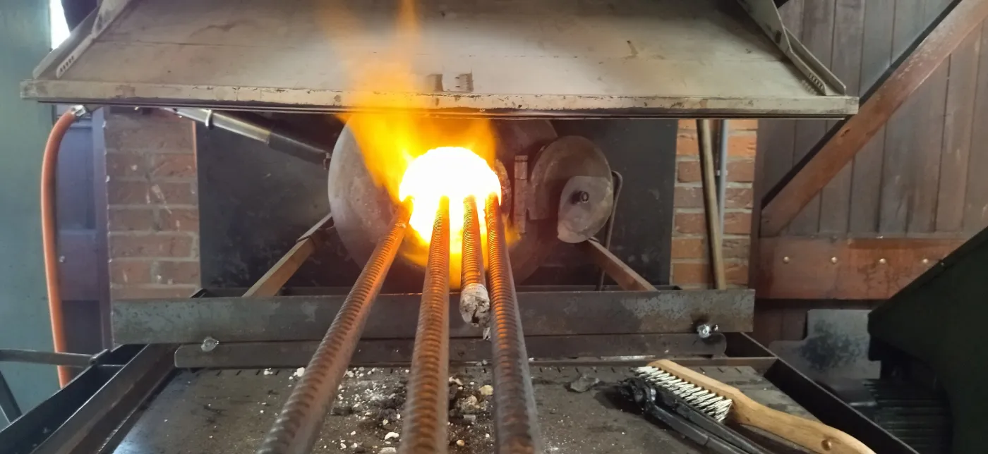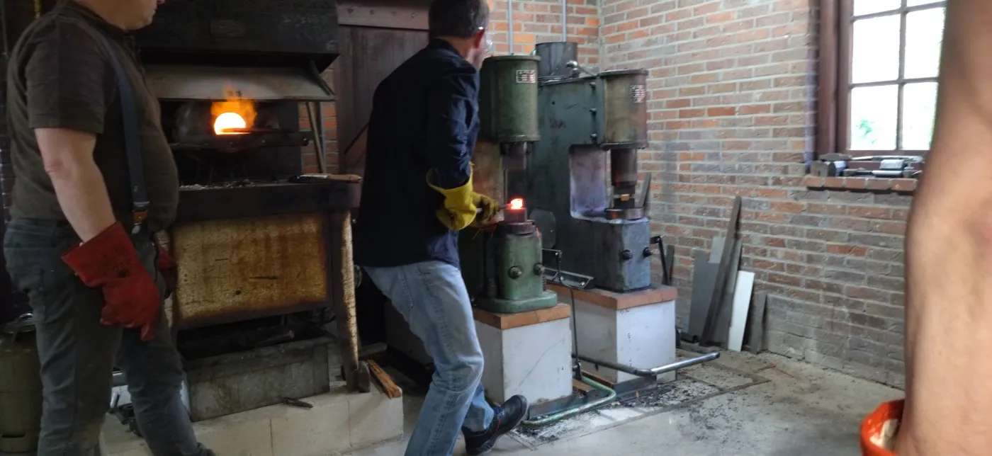 Dann beginnt die eigentliche Arbeit und Du stellst Dein eigenes Damastpaket zusammen und verschweißt es anschließend mit Hammer, Amboss und Lufthammer. Wir falten dieses Paket mehrmals, um die gewünschte Anzahl an Lagen zu erhalten. An diesem Tag wirst Du das alte Handwerk und die Hitze, die zum Schmieden des Stahls benötigt wird, wirklich erleben. Das Endergebnis wird erneut in einem Ofen auf 730°C erhitzt, danach wird es während der Nacht langsam wieder abgekühlt und wir können es am nächsten Tag weiter bearbeiten.