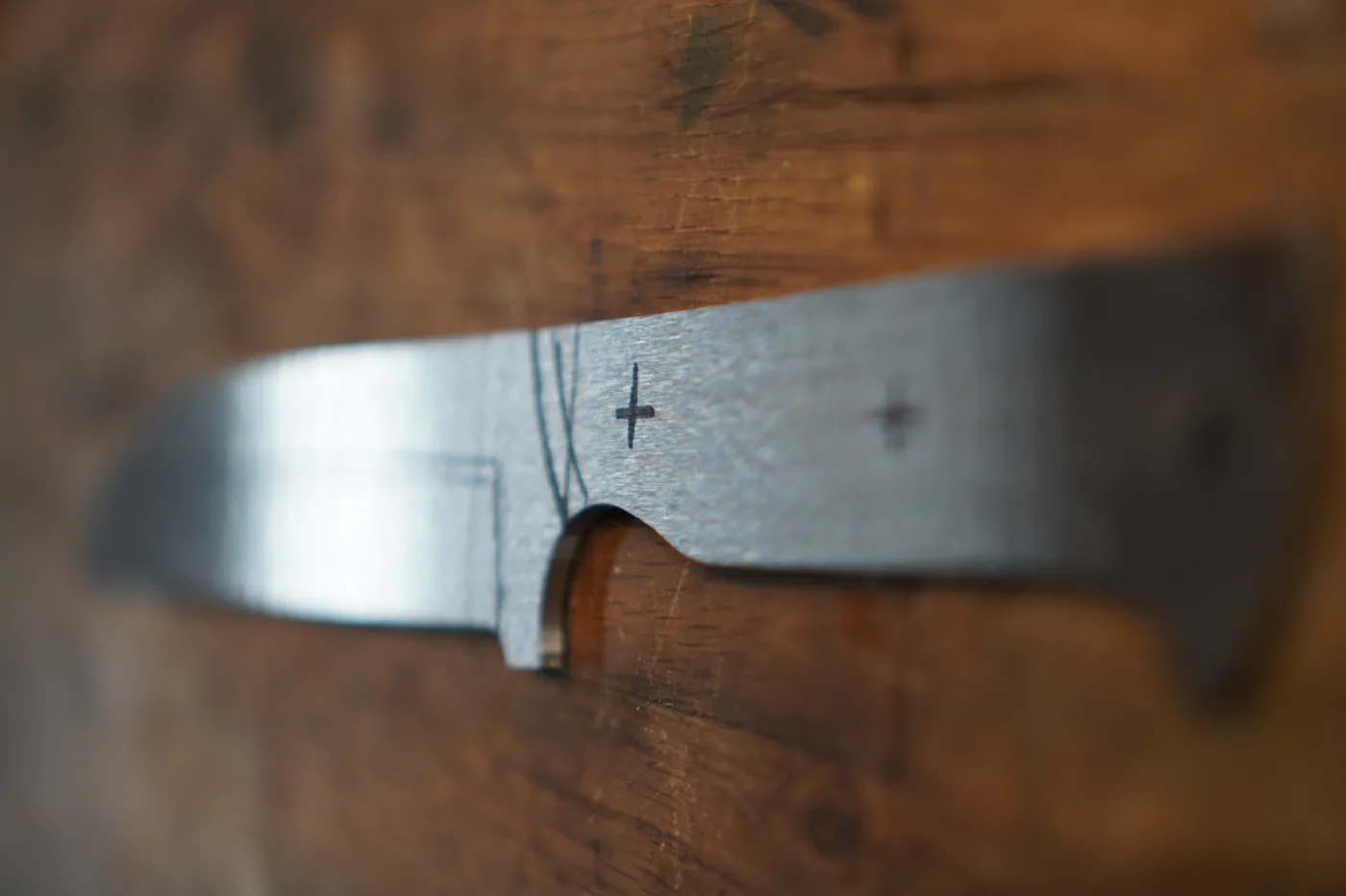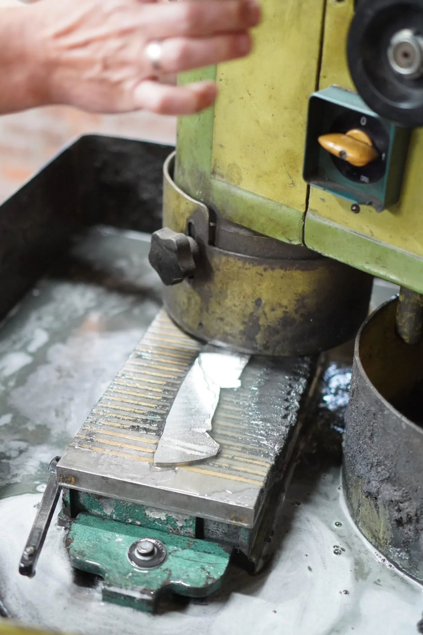 Während dieser recht intensieve Tag verwandeln wir die geschmiedete Damast-Platine in ein Messer. Zuerst übertragen wir die Form der Klinge auf die Platine und sägen und schleifen die Klingengeometrie grob vor. Dann wird der Klingenrohling mittels Topfschleifmaschine perfekt flach geschliffen. und auf die exakt gewünschte Dicke gebracht. Wir verwenden moderne Messerschleifmaschinen, um das Messer zu formen und die Klinge zu schärfen. Das richtige Finish erhält das Messer von Hand durch Feilen und Schleifen. Nachdem die Löcher für die Griffbefestigung gebohrt wurden, führen wir eine optimale Wärmebehandlung des Stahls durch. Nach dem Härten und Abschrecken in speziellem Härteöl lassen wir den Stahl an, um neben einer hohen Härte auch eine ausreichende Zähigkeit der Klinge zu erreichen. Die Klinge wird dann geätzt, wodurch das einzigartige Damastmuster sichtbar wird.