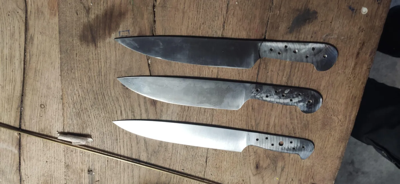 In de GRUNDKURS schmieden wir Küchenmesser mit eine Klingenlänge von 16 cm lang und biz u 4 cm hoch oder Jagd- / outdoormesser mit eine Klingenlänge von 13 cm. Wir schmieden wilder Damast bis zu 200 Lagen. Als Griffmaterial stehen eine vielfalt von edele Hölzer zur Verfügung sowie Kohlenfaser-, Messing- und VA-Stifte.