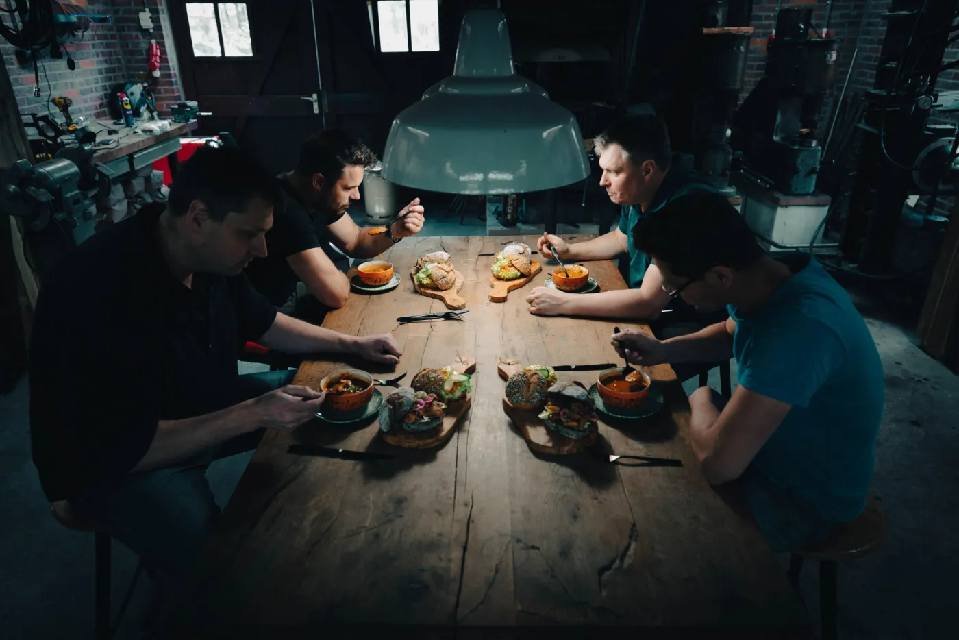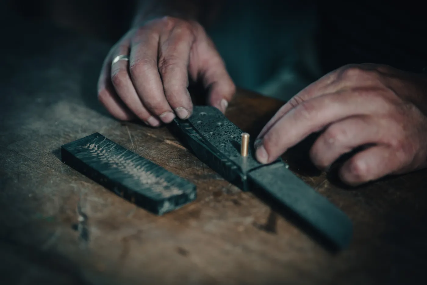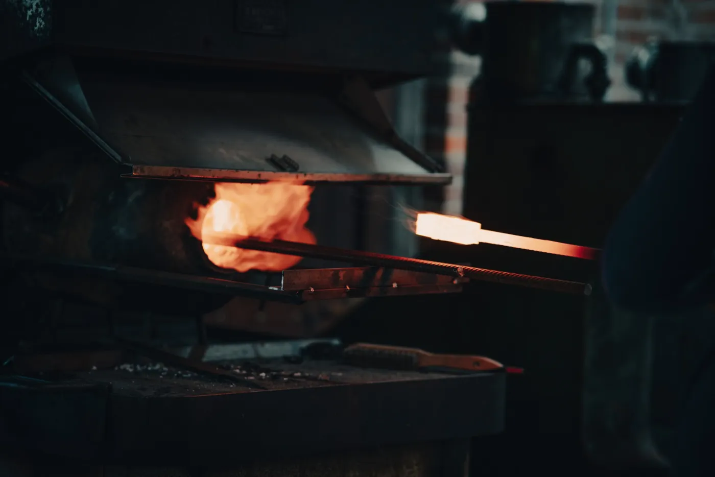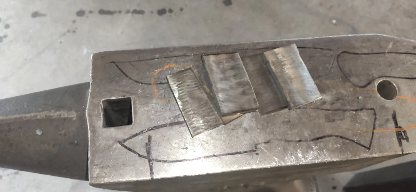 Wenn der Entwurf steht beginnt die eigentliche Arbeit und Du stellst Dein eigenes Damastpaket zusammen und verschweißt es anschließend mit Hammer, Amboss und Lufthammer. Wir falten dieses Paket mehrmals, um die gewünschte Anzahl an Lagen zu erhalten. An diesem Tag wirst Du das alte Handwerk und die Hitze, die zum Schmieden des Stahls benötigt wird, wirklich erleben. Das Endergebnis wird erneut in einem Ofen auf 730°C erhitzt, danach wird es während der Nacht langsam wieder abgekühlt und wir können es am nächsten Tag weiter bearbeiten.