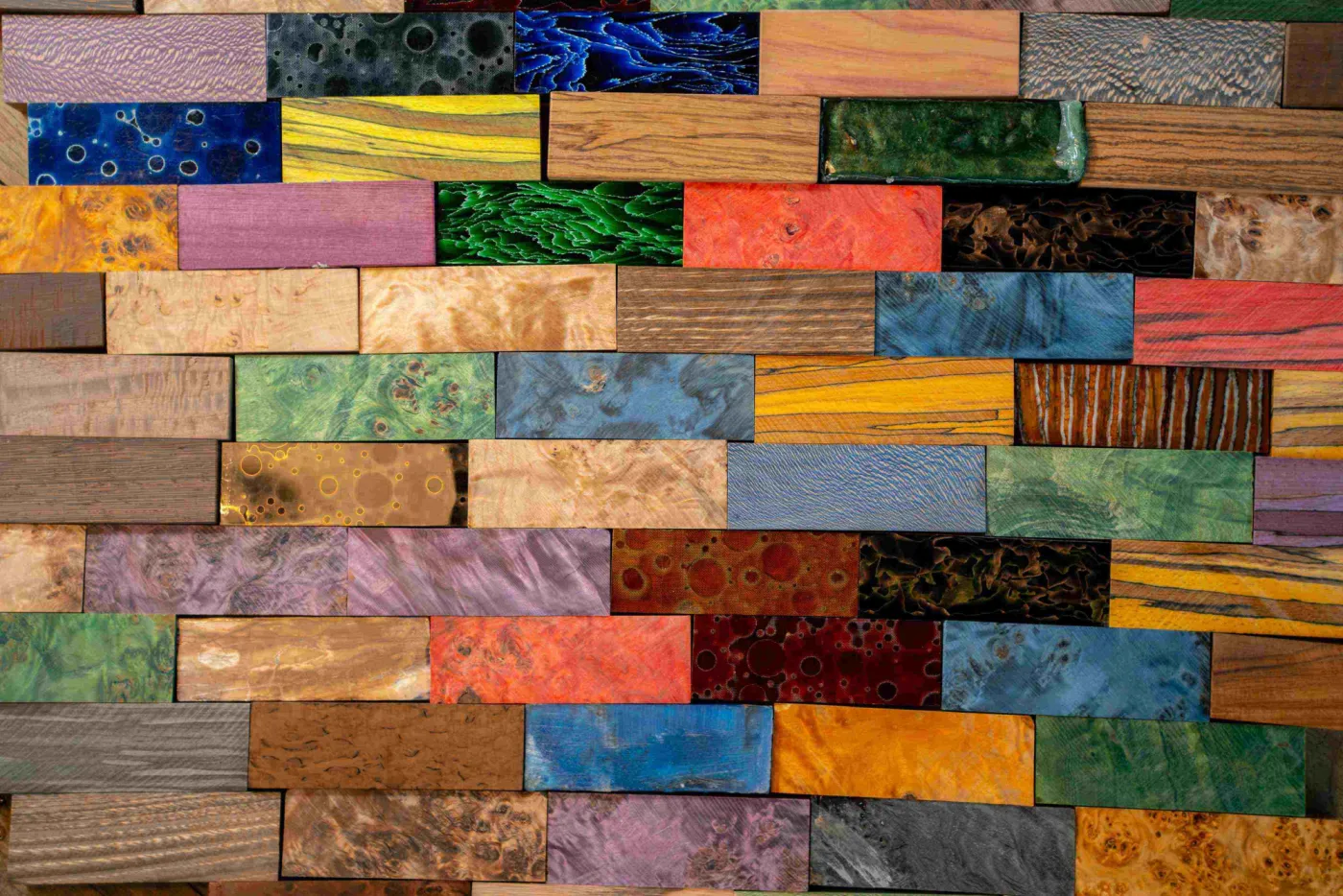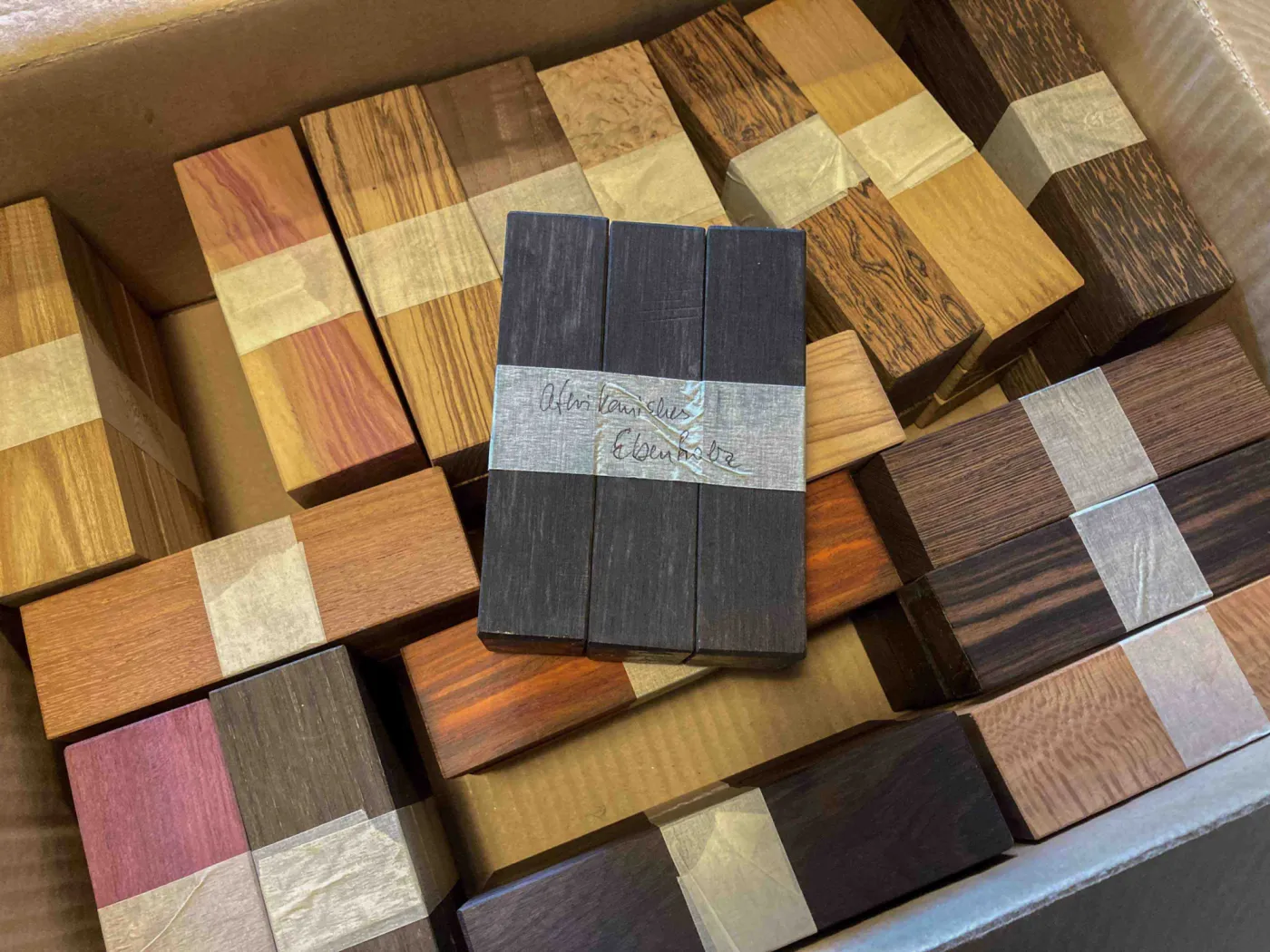 Inklusief sind neben alle luxuöse Holzarten, auch die stabilisierte Hölzer teilweise in allerhande bunter Farben. Vernieten von Messing oder VA Backen am Messer ist ebenfalls möglich ohne Aufpreis.