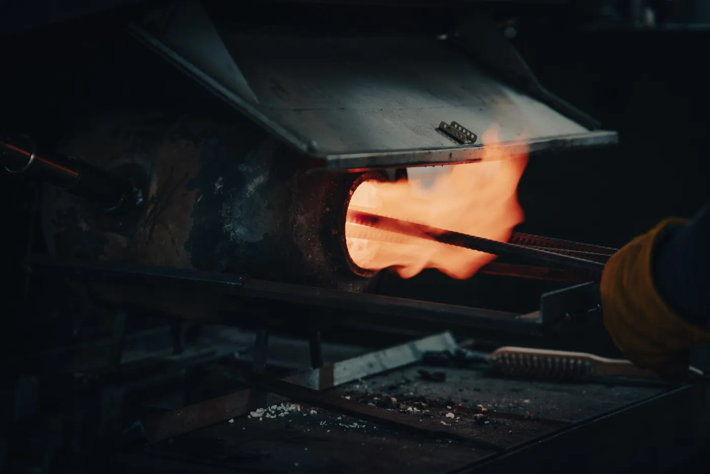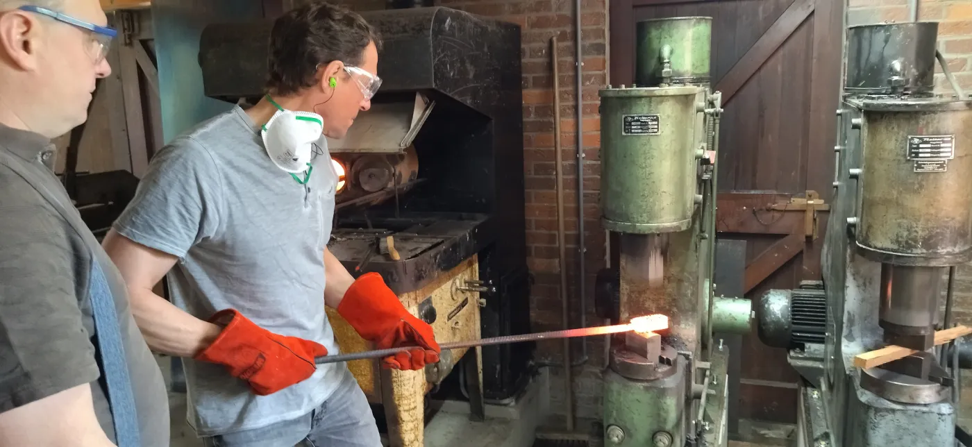 Wenn der Entwurf steht beginnt die eigentliche Arbeit und Du stellst Dein eigenes Damastpaket zusammen und verschweißt es anschließend mit Hammer, Amboss und Lufthammer. Wir falten dieses Paket mehrmals, um die gewünschte Anzahl an Lagen zu erhalten. An diesem Tag wirst Du das alte Handwerk und die Hitze, die zum Schmieden des Stahls benötigt wird, wirklich erleben. Das Endergebnis wird erneut in einem Ofen auf 730°C erhitzt, danach wird es während der Nacht langsam wieder abgekühlt und wir können es am nächsten Tag weiter bearbeiten.