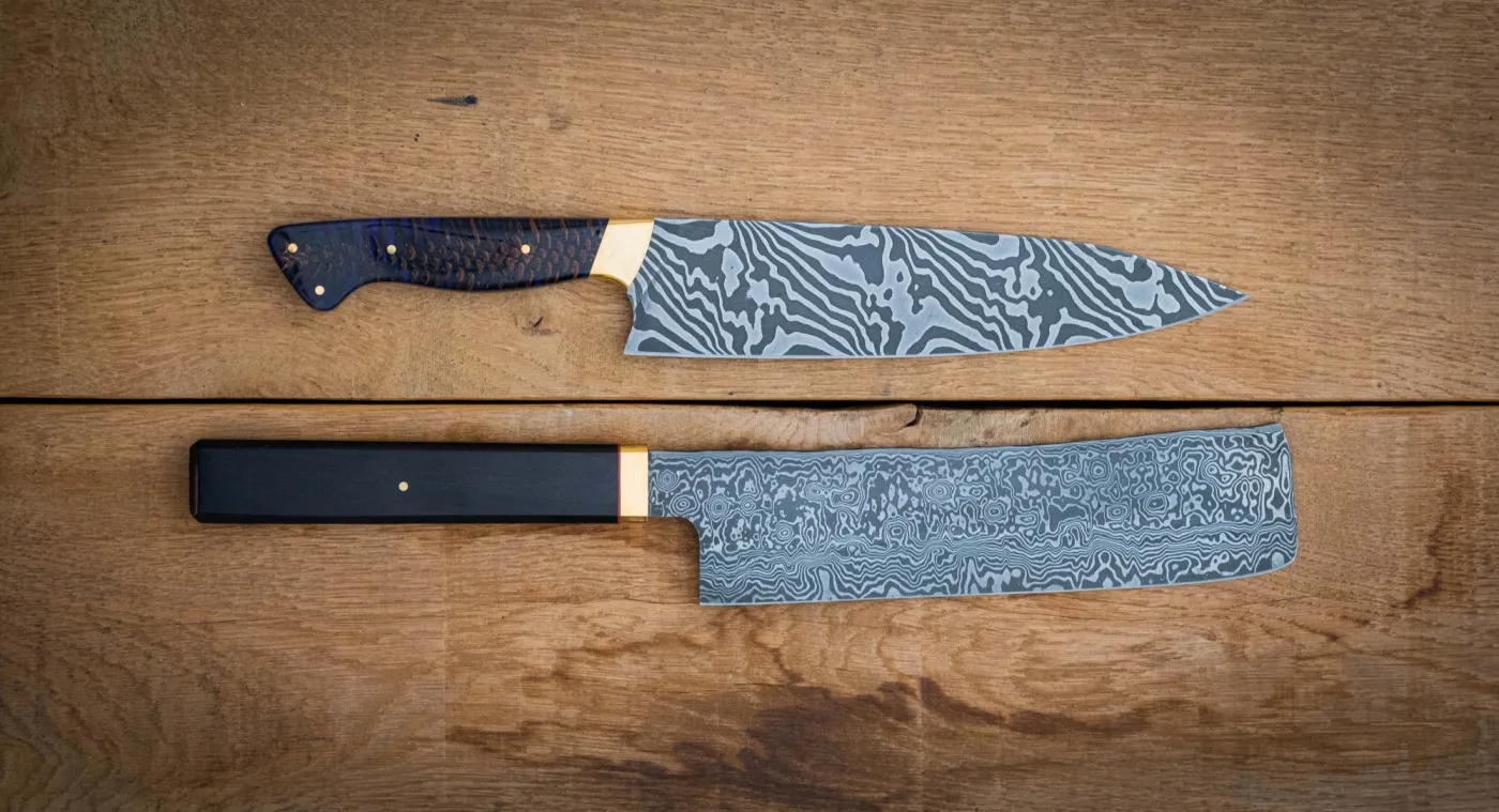Während einen PREMIUM DAMAST SCHMIEDEKURS schmieden wir Messer bis 45 cm Gesamtlänge . Neben Wilder Damast schmieden wir auf wünsch auch Rosen-, Wellen- und Torsionsdamast. Das Anbringen von eine Schneidlage von andersartige Stähle ist auf Wünsch möglich.